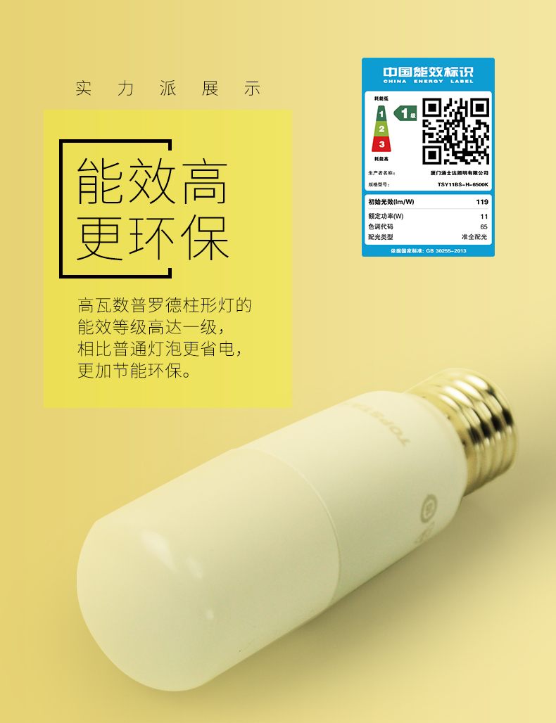 高瓦數普羅德柱形燈的能效等級高達一級,相比普通燈泡更省電,更加節能環(huán)保。